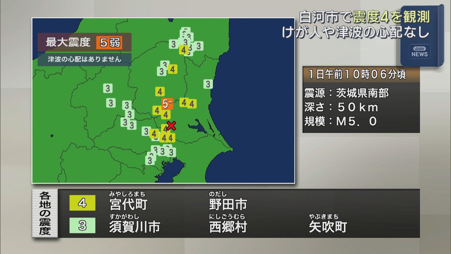 午前10時すぎ、茨城県南部を震源とする最大震度5弱の地震が発生し、県内では白河市で震度4を観測しました。気象庁によりますと、午前10時6分ごろに起きた地震は、震源の深さが50キロ、地震の規模を示すマグニチュードは5.0と推定されています。この地震によ...