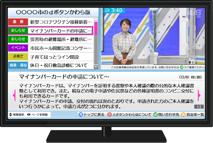 『dボタンかわら版』は、県内市町村の情報をテレビのデータ放送画面で見ることができるサービスです。